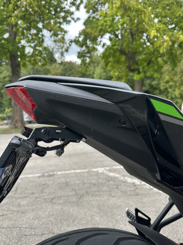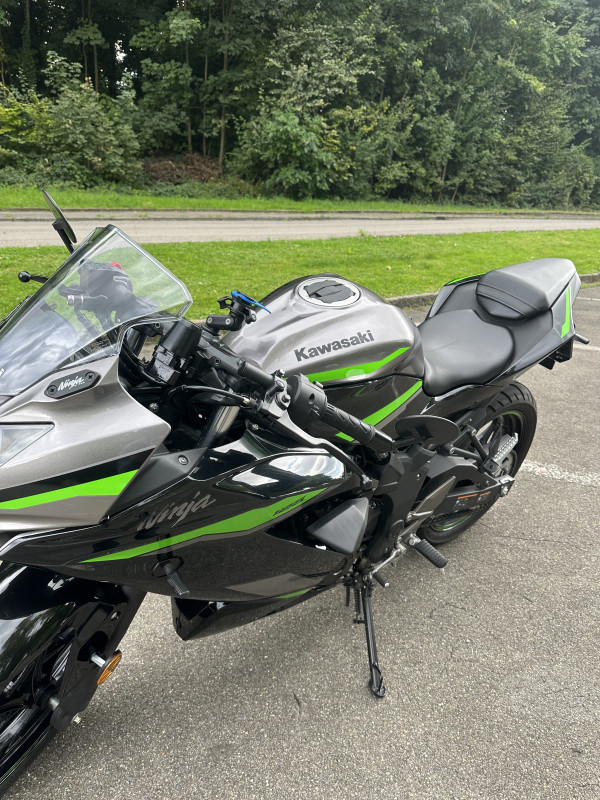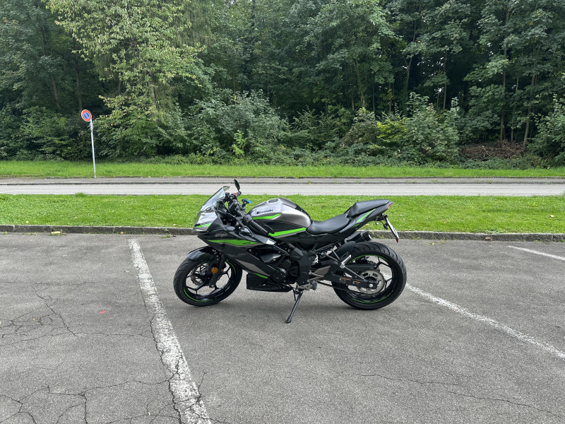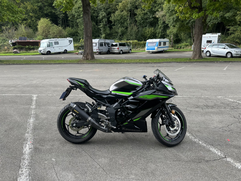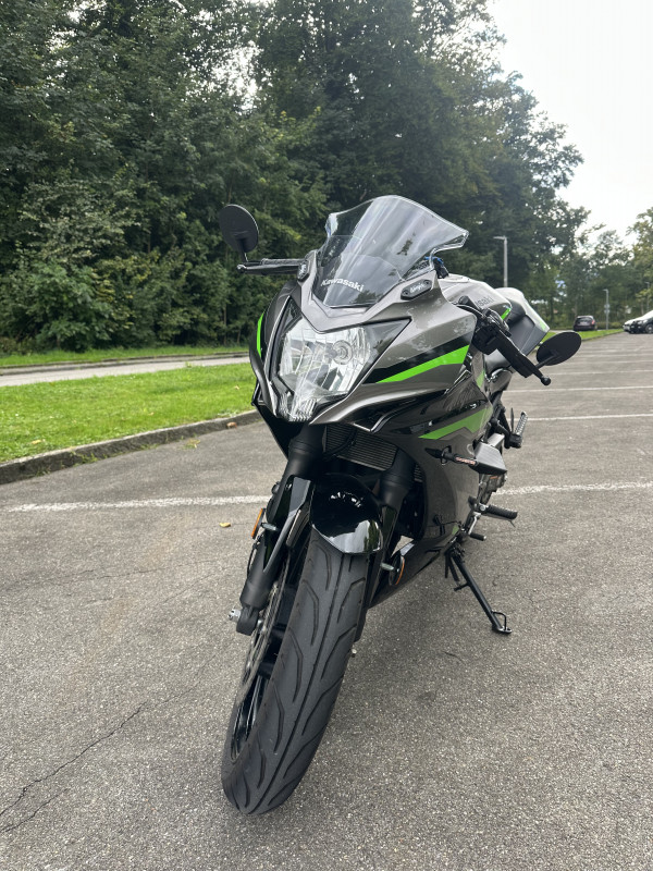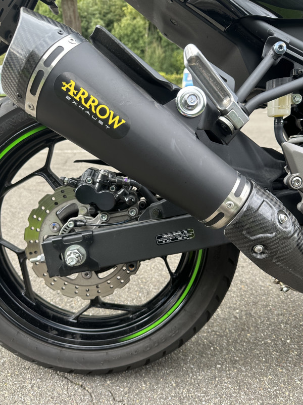 Verbaut sind Lenkerendenspiegel, die der Ninja einen sportlichen Look verleihen und gleichzeitig für eine bessere Übersicht sorgen. Ausserdem ist eine hochwertige Arrow Auspuffanlage mit Beiblatt montiert, diese sorgt für einen kernigen Sound, bleibt aber im legalen Bereich. Am Heck wurde ein Umbau mit kleinen LED-Blinkern vorgenommen, wodurch das Motorrad deutlich schlanker und moderner wirkt.