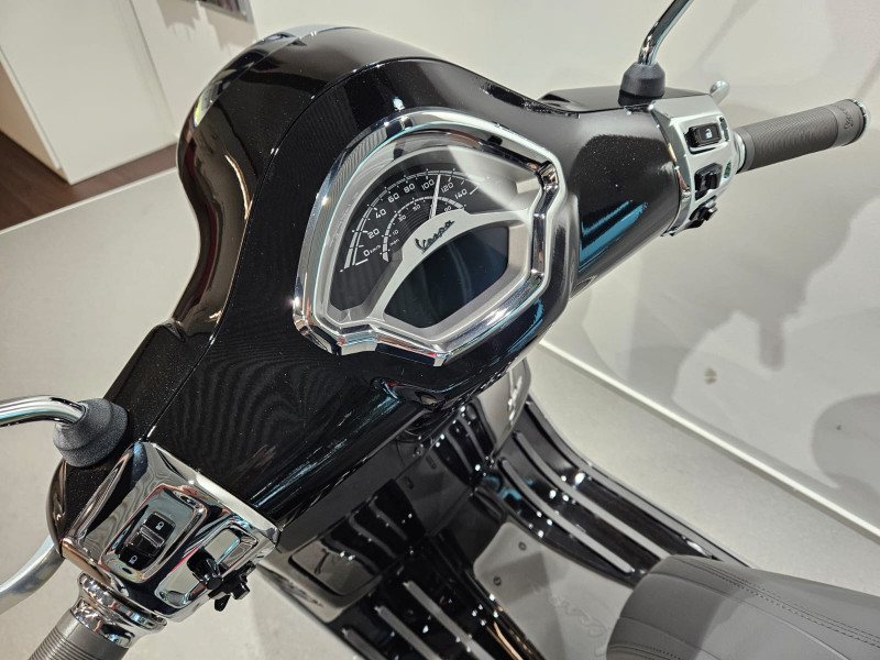 Die Vespa GTS bietet standardmässig fortschrittliche Funktionen wie schlüsselloser Zündung, ferngesteuerter Sitzverstellung und Bike Finder sowie einem analogen LCD-Display und einem praktischen USB-Anschluss im Beinschildfach ausgestattet.