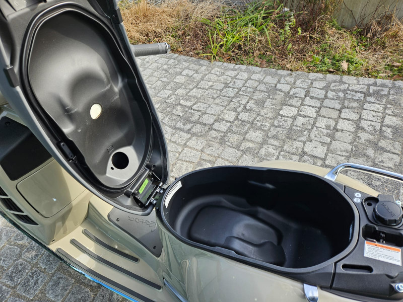 Die Vespa GTS bietet standardmässig fortschrittliche Funktionen wie schlüsselloser Zündung, ferngesteuerter Sitzverstellung und Bike Finder sowie einem analogen LCD-Display und einem praktischen USB-Anschluss im Beinschildfach ausgestattet.