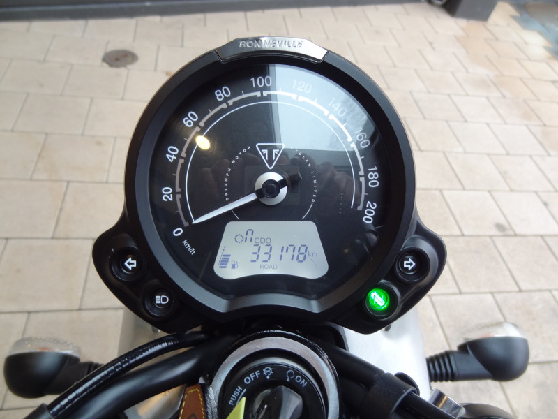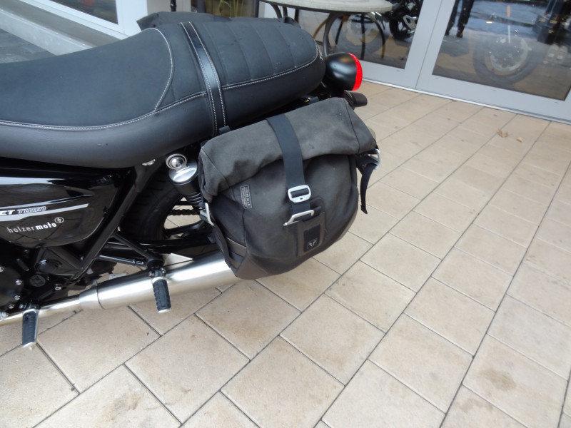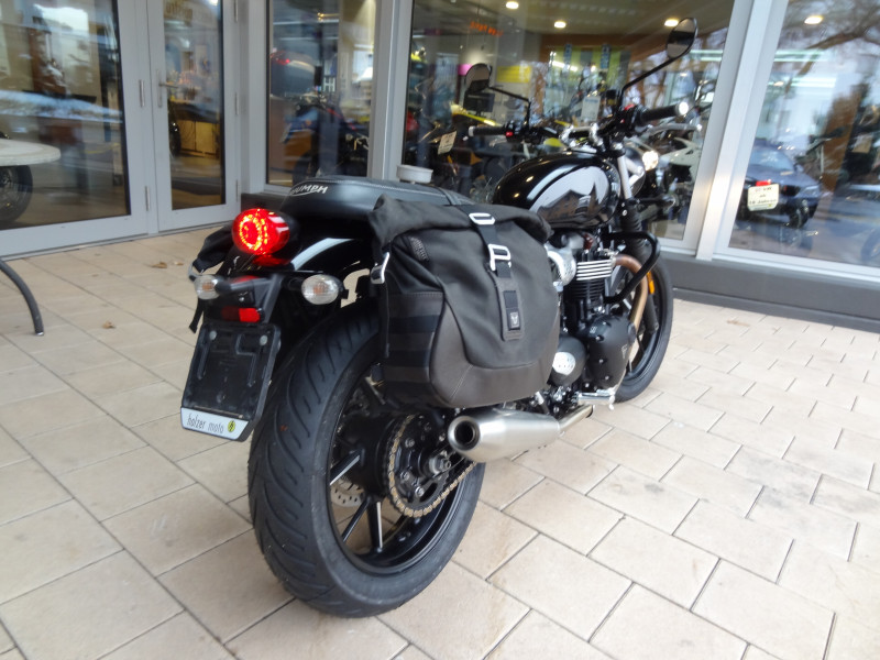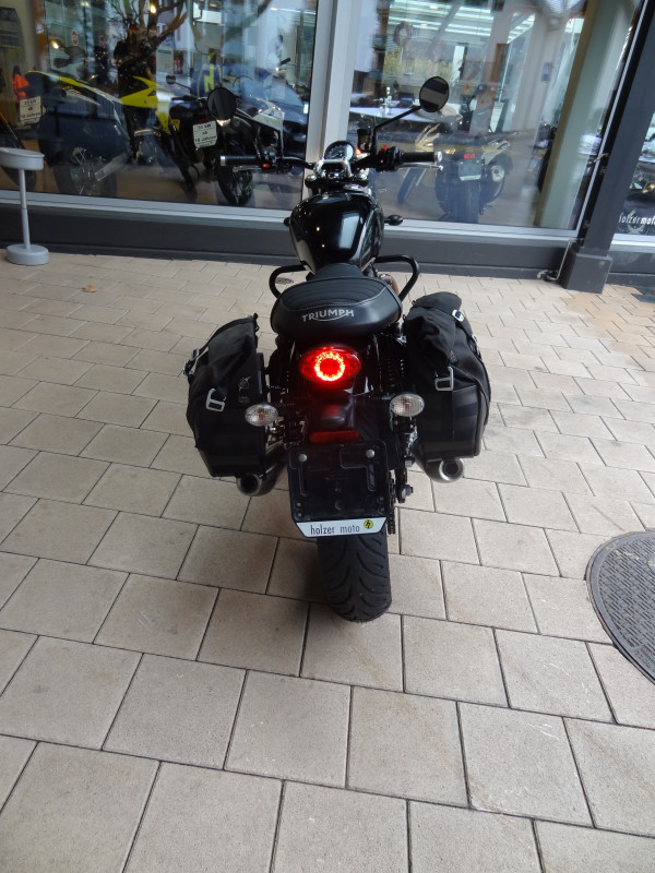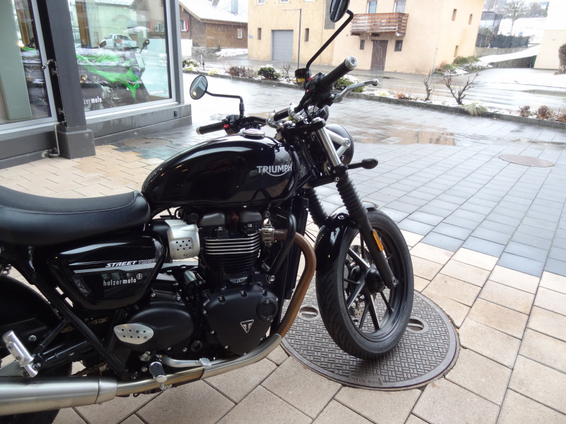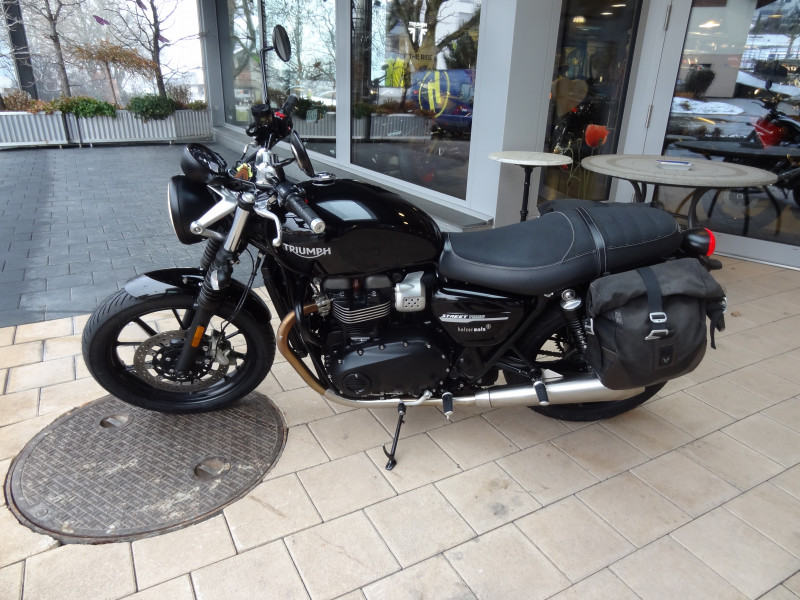 Die Triumph Street-Twin 900 ist in einem top Zustand. Die beiden Reifen vorne und hinten sind neu sowie die Bremsflüssigkeit. Der Service wurde mit 30'756 km ausgeführt (Wechsel von Öl & Ölfilter, Luftfilter, Zündkerzen und Kühlflüssigkeit sowie Kontrolle von Ventilspiel und Ventildeckel neu abdichten). Bremsbeläge vorne und hinten wurden mit 32'135 km ersetzt. Zu ihrem Zubehör gehören die Seitenkoffer, Sturzbügel sowie die Heizgriffe. Gegen einen Aufpreis von 465.- CHF kann die Triumph auf 35kW plombiert werden.